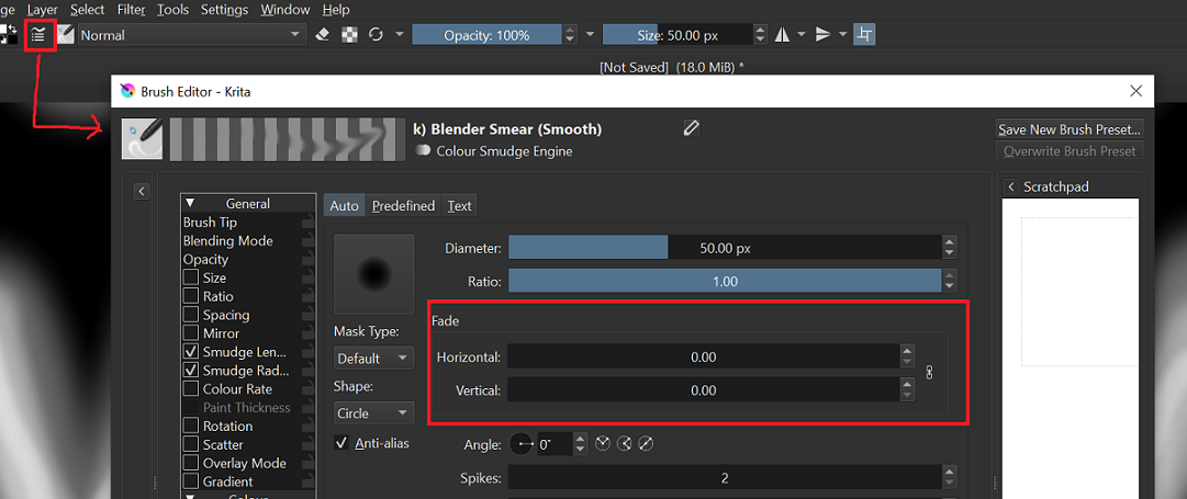 Clean up the texture by using the brush Smear Brush. Set the Horizontal & Vertical Fade to zero, with opacity around 20-40%